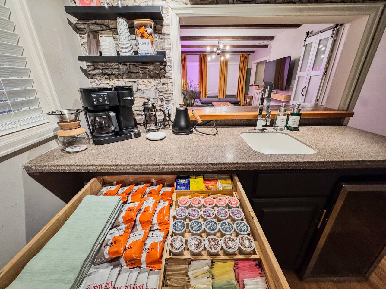 Living Room ✓75 inch TV (bring your own log-ins to stream your favorite shows) ✓Vegan Leather Couch ✓2 Boucle Swivel Chairs ✓Cordaroy Bean bag (converts to a Queen Sized bed) ✓ Heated Massage Chair with Bluetooth Speakers ✓Arcade with 3,000 games to choose from ✓Wood burning fireplace 🥘 Dining Room ✓Dining table with chairs ✓Piano / Keyboard 🖥️ Workspace ✓Apple desktop (Safari access only) ✓Canon Inkjet Printer (Wireless / wired) 🧑🍳 Kitchen ✓Coffee Station (Drip coffee maker, Keurig, Pour over, French Press) ✓Regular & decaf coffee: K-cups, individual coffee grounds ✓Tea ✓Sugar / sugar substitutes & Creamer / Honey ✓Toaster ✓Air Fryer ✓Blender ✓Pressure cooker ✓Indoor Grill ✓Food dehydrator ✓Dinnerware & Silverware ✓***👶Kid’s Dinnerware & Silverware ✓*** 👶 High chair with tray ✓ ***🐾 dog bowls, adjustable dog feeding station 🛏️ Bedroom 1 (with En Suite Bathroom) ✓King Bed with Memory Foam Mattress ✓Soft Down Alternative FIll Mattress Topper ✓Linens / Sheets ✓Alarm Clock ✓White Noise Machine ✓Air Purifier ✓Luggage Rack ✓ *** 👶 Pack n Play with mattress & sheets 🚿 En Suite Bathroom ✓6 inch rain shower head ✓Bidet ✓Towels ✓Shampoo, Conditioner, Body Wash, Lotion ✓ *** 👶 infant bath seat 🧺 Laundry ✓Washer ✓Dryer ✓Iron / Steamer 🏝️ Outdoor (Fully Fenced) ✓Giant Jenga ✓Cornhole/ Bean bag toss ✓Telescope for stargazing ✓Dining table with chairs ✓Adirondack chairs ✓Solo Stove Smokeless Firepit ✓Ninja Electric Gril ✓***🐾 Poop bags / trash station 🎲Detached Garage ✓Indoor Hot Tub ✓ Projector Screen (Roku TV - bring your own log-ins to stream your favorite shows) ✓ Pool Table ✓ 2 player arcade table ✓ Shooting Arcade ✓ Driving Arcade ✓ Basketball Arcade