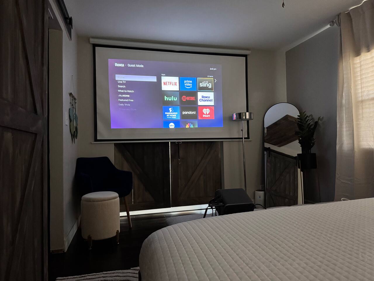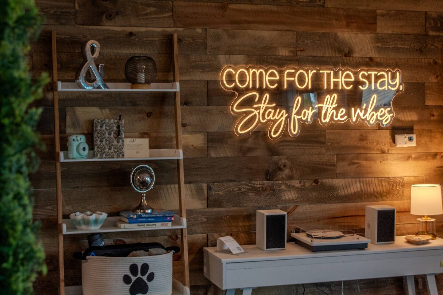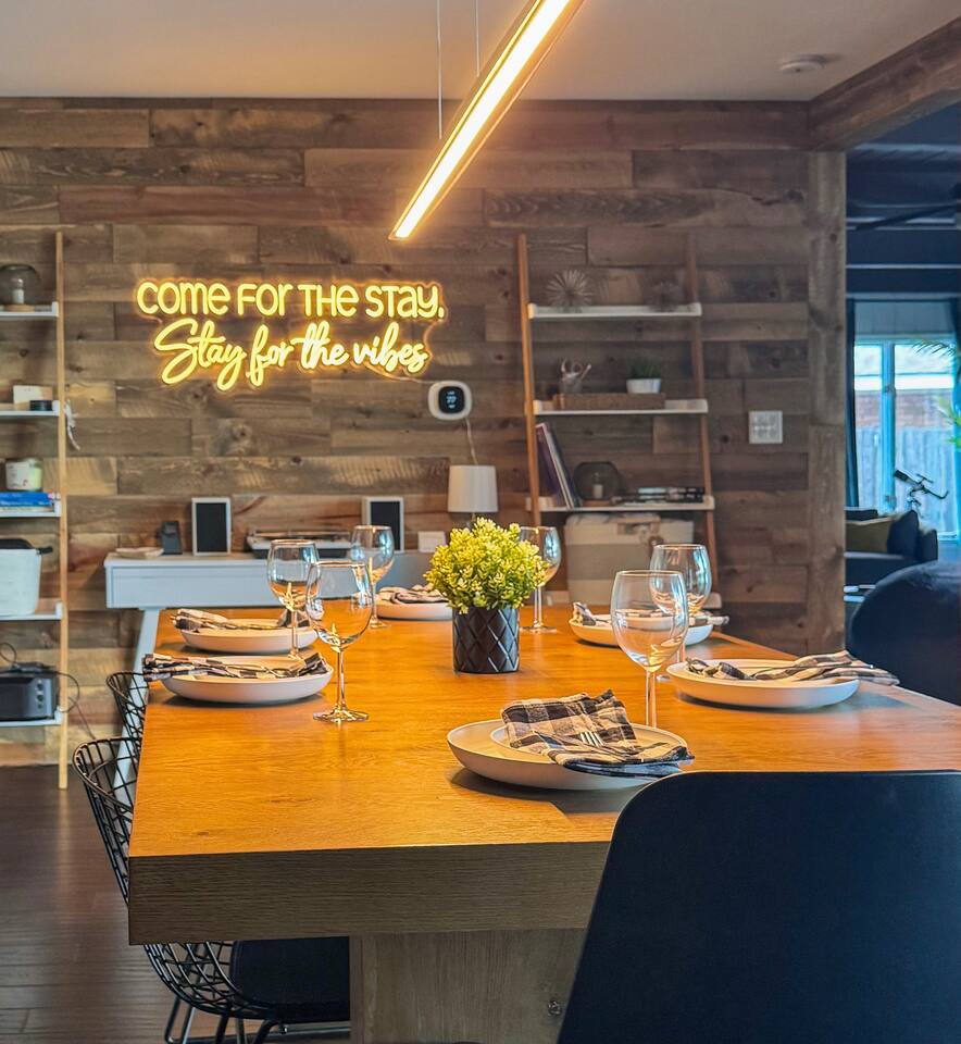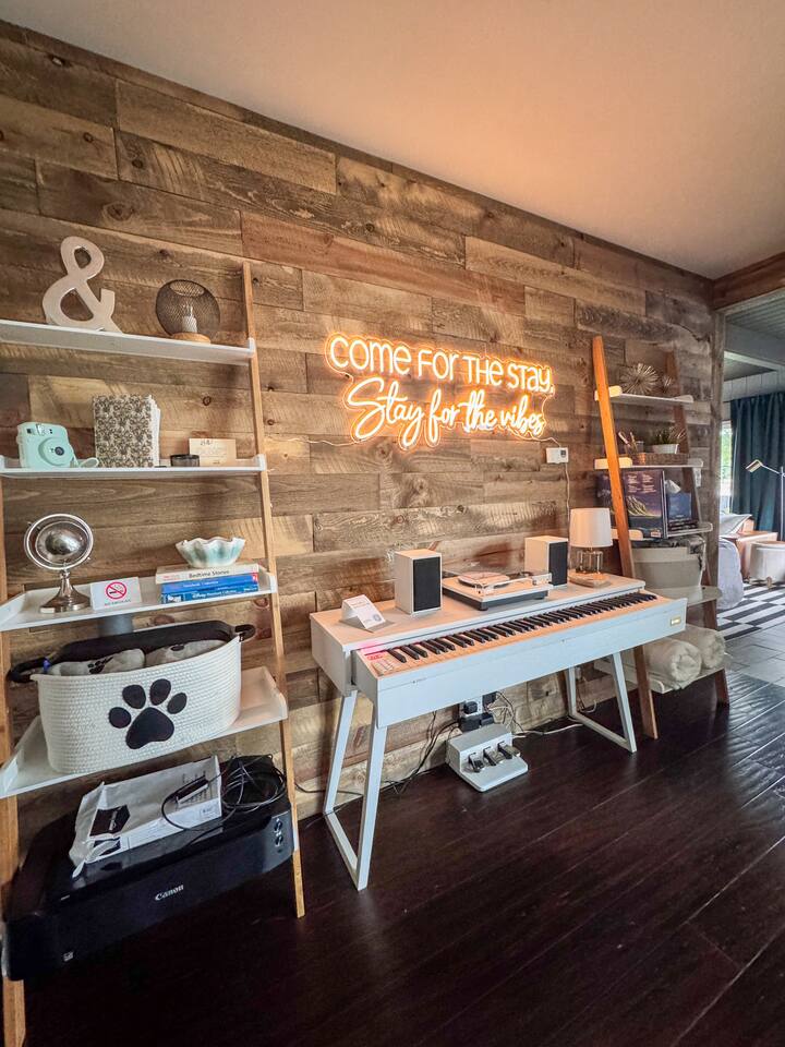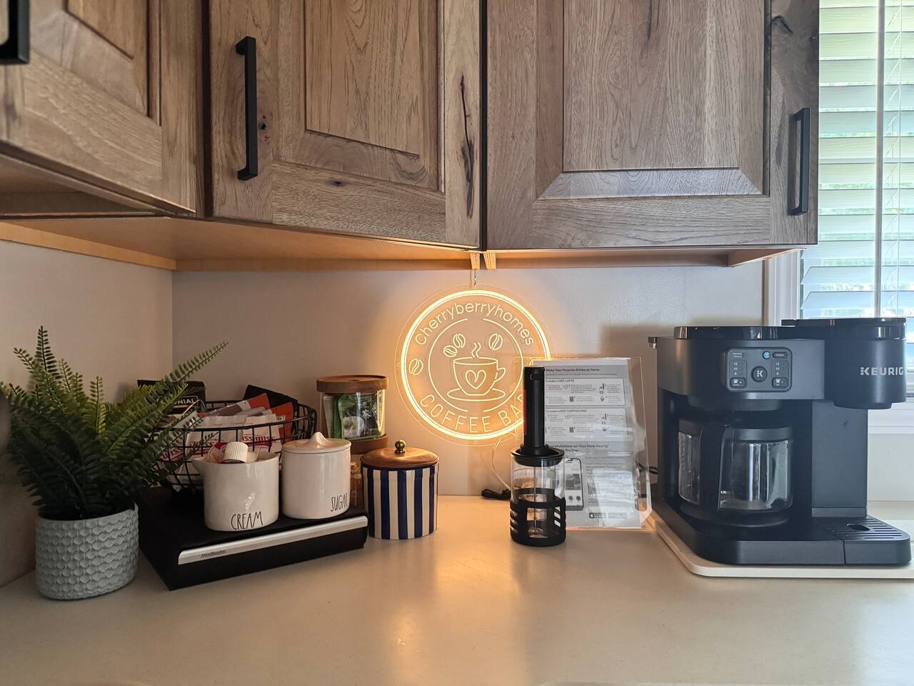 🛋️ Living Room ✓75 inch TV (bring your own log-ins to stream your favorite shows) ✓Vegan Leather Couch ✓2 Boucle Swivel Chairs ✓Cordaroy Bean bag (converts to a Queen Sized bed) ✓ Heated Massage Chair with Bluetooth Speakers ✓Arcade with 3,000 games to choose from ✓Wood burning fireplace 🥘 Dining Room ✓Dining table with 6 chairs ✓Piano / Keyboard 🖥️ Workspace ✓Apple desktop (Safari access only) ✓Canon Inkjet Printer (Wireless / wired) 🧑🍳 Kitchen ✓Coffee Station (Drip coffee maker, Keurig, Pour over, French Press) ✓Regular & decaf coffee: K-cups, individual coffee grounds ✓Tea ✓Sugar / sugar substitutes & Creamer / Honey ✓Toaster ✓Air Fryer ✓Blender ✓Pressure cooker ✓Indoor Grill ✓Food dehydrator ✓Dinnerware & Silverware ✓***👶Kid’s Dinnerware & Silverware ✓*** 👶 High chair with tray ✓ ***🐾 dog bowls, adjustable dog feeding station 🧺 Laundry ✓Washer ✓Dryer ✓Iron / Steamer 🛏️ Bedroom 1 ✓King Bed with Memory Foam Mattress ✓Soft Down Alternative FIll Mattress Topper ✓Linens / Sheets ✓Alarm Clock ✓White Noise Machine ✓Air Purifier ✓Luggage Rack ✓ *** 👶 Pack n Play with mattress & sheets 🛏️ Bedroom 2 ✓King Bed with Memory Foam Mattress ✓Soft Down Alternative FIll Mattress Topper ✓Linens / Sheets ✓Alarm Clock ✓White Noise Machine ✓Air Purifier ✓Luggage Rack 🚿 Bathroom ✓6 inch rain shower head ✓Bidet ✓Towels ✓Shampoo, Conditioner, Body Wash, Lotion ✓ *** 👶 infant bath seat 🏝️ Outdoor ✓Giant Jenga ✓Cornhole/ Bean bag toss ✓Telescope for stargazing ✓Dining table with chairs ✓Sectional couch under covered pergola ✓Adirondack chairs ✓Ninja Electric Grill ✓Standard Firepit ✓Smokeless Firepit ✓Wood logs ✓***🐾 Poop bags / trash station